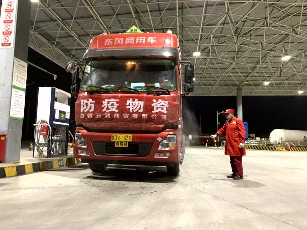 與車隊交流得知,車隊于2月12日從青海格爾木出發(fā),裝載著消毒液送往浙江溫州防疫一線,已在路上行駛了兩天約1800公里??粗緳C師傅疲憊的樣子,站區(qū)員工第一時間為他們送上熱水和簡餐,還給他們留了站區(qū)服務(wù)電話,隨時提供路況、加氣咨詢等服務(wù)。為盡快運抵防疫物資,車隊經(jīng)過一個多小時的休整,又向防疫一線進發(fā)了。